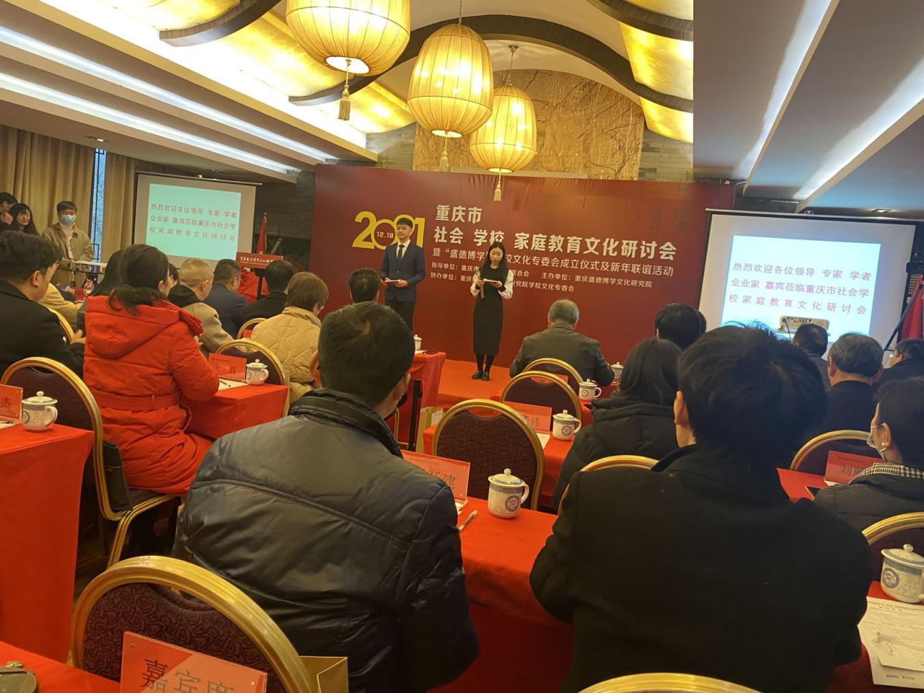 为庆祝中国共产党成立100周年,全面深入贯彻习近平总书记关于社会主义文化建设重要论述,加强新时代社会主义文化建设,2021年12月18日,重庆市社科界第七届学术年活动资助项目“重庆市社会、学校、家庭教育文化研讨会”在沙坪坝区歌乐山枫香园酒店隆重举行。会议由重庆盛德博学文化研究院主办。围绕“教育文化的传承与创新”这一主题,探索新形势下社会、学校、家庭文化“三位一体”的构建机制及学校文化构建的路径与方法。