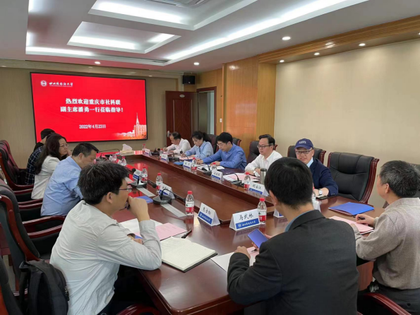 2022年4月23日上午,重庆市社科联党组成员、副主席潘勇一行到四川外国语大学进行工作调研。四川外国语大学副校长祝朝伟、科普基地负责人、部分学会负责人、教学单位、科研机构负责人出席了座谈会。座谈会由科研处处长胡安江主持。