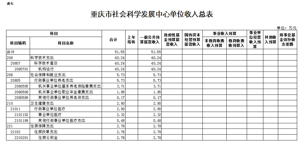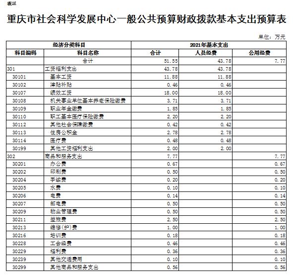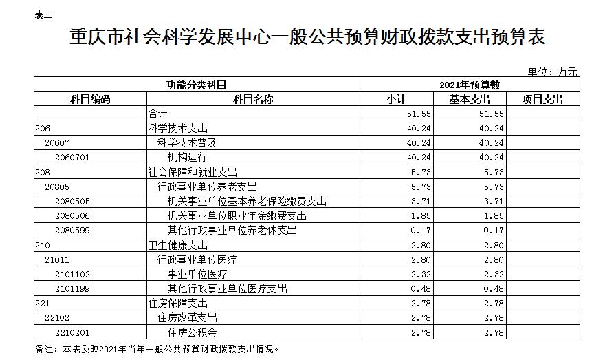 2021年一般公共预算财政拨款收入51.55万元,一般公共预算财政拨款支出51.55万元,比2020年增加51.55万元。其中:基本支出51.55万元,比2020年增加51.55万元,主要原因是2021年以前未纳入预算,无财政拨款收入,主要用于保障在职人员工资福利及社会保险缴费,保障单位正常运转的各项商品服务支出等;市社科发展中心2021年无项目支出预算。