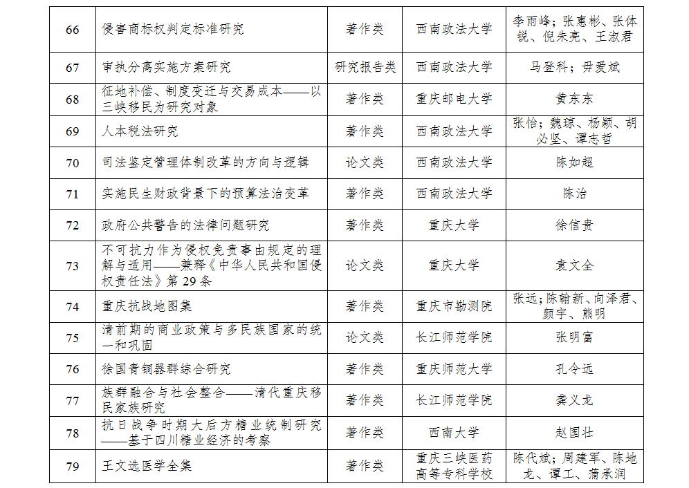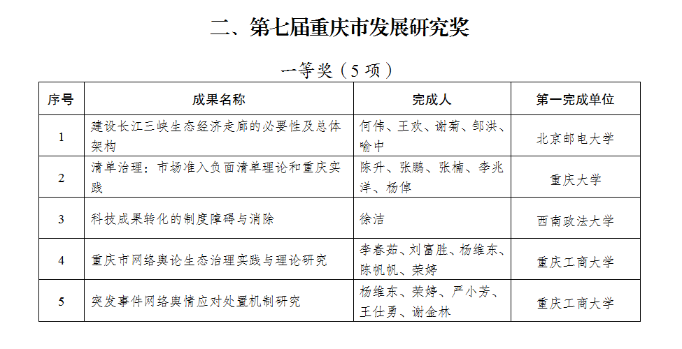经市政府常务会议审定,重庆市第十次社会科学优秀成果奖拟表彰成果150项,其中一等奖15项、二等奖45项、三等奖90项;第七届重庆市发展研究奖拟表彰成果50项,其中一等奖5项,二等奖12项,三等奖33项(同一等级的获奖成果排名不分先后)。根据《重庆市社会科学优秀成果奖励办法》、《重庆市发展研究奖奖励办法》和《市评比达标表彰工作协调小组关于市委、市政府评比达标表彰项目评审工作流程》有关规定,现将拟表彰成果向社会公示,公示时间为5个工作日(从2020年12月22日至2020年12月28日)。